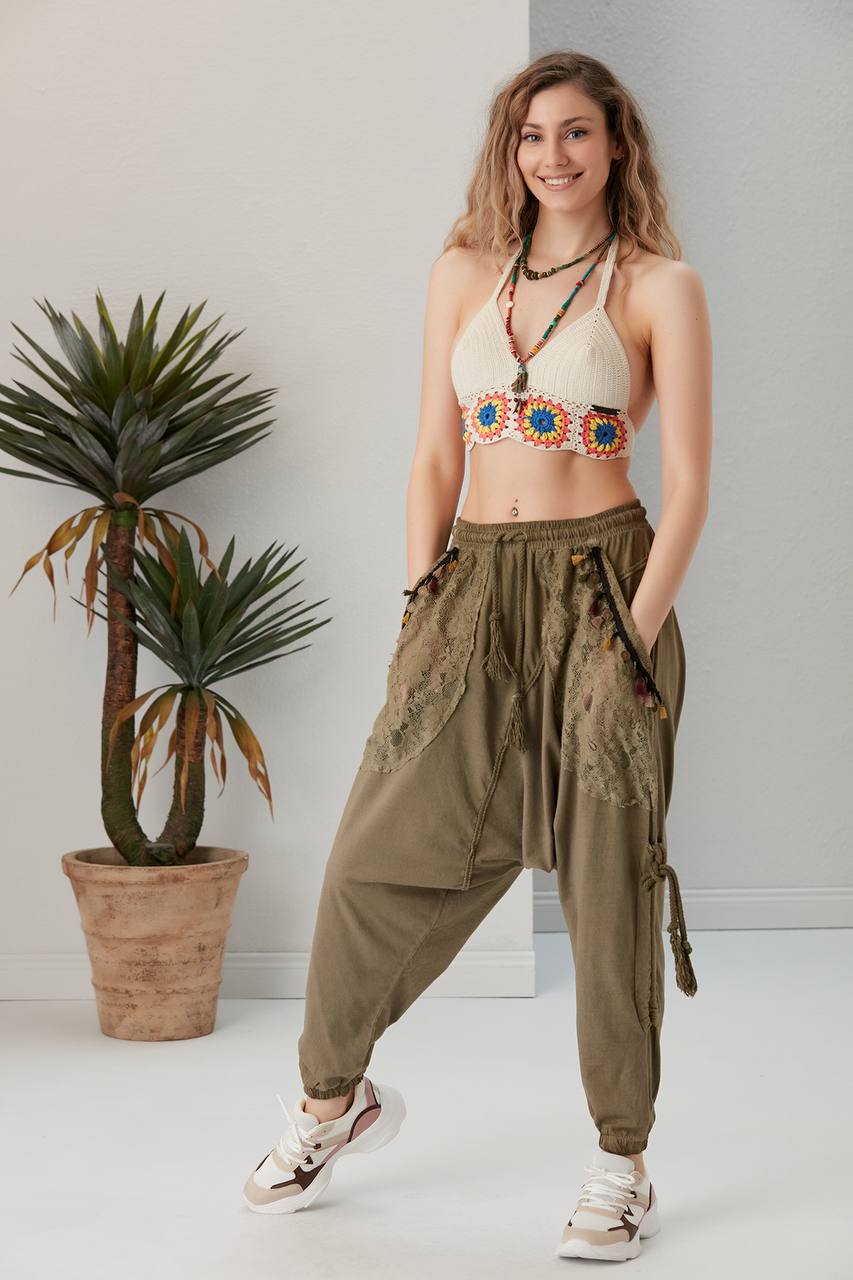 Tansaj Otantik Kadın Antrasit Dantel Detaylı Etnik Otantik Şalvar %100 Pamuklu